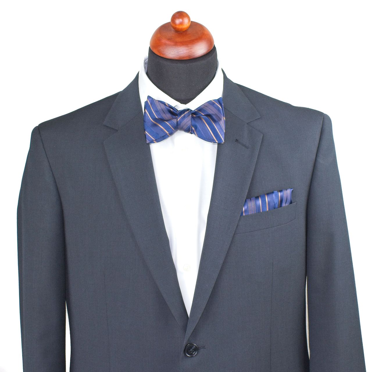 Auf dem kräftig blauen Grund kommen die feinen Streifen besonders schön zur Geltung. Diese Fliege passt sowohl zum blauen als auch grauen Anzug und lässt sich perfekt mit weiteren Accessoires für Männer ergänzen.